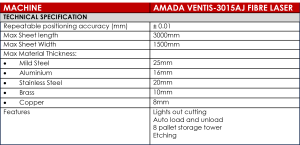 The VENTIS-3015AJ is an innovative fibre laser processing machine that uses ground breaking technology for sheet metal cutting. AMADA’s Locus Beam Control (LBC) technology is revolutionary, with an innovative beam shaping system that allows for precise control of the laser beam motion. This creates possibilities never accomplished before with solid state laser cutting machines.